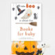 Featuring cute watercolor of baby ghost and Halloween aesthetics. A little boo is almost due! Halloween themed baby shower with watercolor ghost, black cat, witch's hat, magic mop ( broomstick ), spider hanging from a web. The little ghost is eating a lollipop.