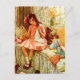 Vintage illustration of a little girl sewing by the window. She is surrounded by all her toys, such as a teddy bear and many dolls. From "The Little Girl's Sewing Book".