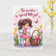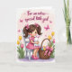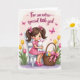 This card features a young girl with brown pigtails tied with pink bows, sitting on a light gray chair and cuddling a white long-eared plush bunny 🐇. She wears a pink dress with lace edging, and her gentle smile and the way she holds the toy suggest a sweet, affectionate bond. Behind her, spring flowers rise in soft yellows and pinks, with tulips standing tall like they’re framing the moment 🌷. A woven basket nearby is filled with speckled egg shapes, and a wide pink ribbon loops around the handle as if it was set down after being carried for someone special. Small fuchsia butterflies drift across the scene, adding motion that feels like a quiet shared laugh in the air. Near the top, the message “For an extra-special little girl” appears in flowing dark lettering, centered above the illustration. The background fades from pale pink at the top into a light lavender tone toward the bottom edge.