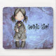 A lovely little girl in gothic style. She is wearing a black and white polka dot dress and a purple scarf, she has black hair in pigtails. On the scarf she is wearing a skull brooch, with her right arm she is holding a little cat plush...of course more dead than alive :) She has a slightly surprised expression on her face and she is incredibly cute. She is standing against a purple/bluish floral background. The mousepad comes with the text "gothic girl" but you can customize it with your own if you like. From my original painting ink and watercolor on paper.