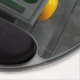 This awesome photograph on a mousepad features a cool grey toy robot with dark green eyes and bright yellow ears against a metal background. This robotic little dude is ready to give your desk some cool, robotic style!