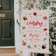 Cute ladybug theme baby shower welcome sign featuring illustration of cute red and pink bugs with wildflowers and stars. The text says "a little ladybug is on the way."