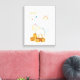 Adorable canvas print features a little lamb with a pink bow on her head as she stands atop baby blocks in a nursery. A baby's mobile and a small picture of a rainbow are behind her.
