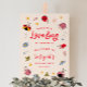 Cute ladybug theme birthday party welcome sign featuring illustration of cute red and pink bugs with wildflowers and stars. The text says "our little lovebug is turning X."