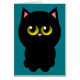 Cute cartoon black cat with big round yellow eyes,pink ears and a pink nose, sitting upright and staring right at you, on a blue background.
