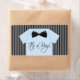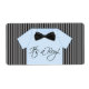 Little man water bottle labels with cute blue shirt and black bow tie on a gray and black pinstripe background. This adorable black and blue little man baby shower water bottle label can be customized with your text, and you can remove and move the It's a boy words. These are not waterproof.