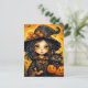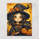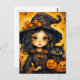 This adorable and gothic postcard features a young adult witch and her trusted black kitten. Please feel free to add your unique text and address to the reverse side of this Halloween postcard.