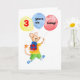 A birthday card for a 3-year old with a handpainted cheeky mouse, holding a gift and balloons with the words '3 years old today! Inside text is 'Happy Birthday'