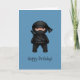 Adorable chubby yet fearsome looking little ninja is dressed in black outfit and carrying katana - traditional Japanese sword.