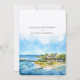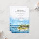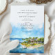 Transport your guests to a tropical paradise with this breathtaking watercolor wedding invitation. The design showcases a stunning illustration of a luxurious Florida Keys resort, complete with swaying palm trees, crystal-clear turquoise waters, and a coastal ambiance. The elegant and classic typography is set against a soft blue watercolor wash, perfectly complementing the beautiful beach scene below. This invitation is ideal for a luxurious destination wedding, a chic beach ceremony, or any coastal-themed celebration. All text is a fully customizable template, allowing you to easily add your personal wedding details.