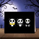 Two little pandas sitting in the dark with a tiny skeleton. One Panda is wearing a yellow tee shirt with the word "meh" on it.