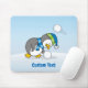 A little penguin cartoon bending to get a snow ball avoiding another one. Custom text.