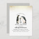 An adorable watercolor illustration featuring two parent and a baby penguin. Your custom name appears in a stylish lettering style script font with your party details below. At the top of the invites there is faux gold confetti. These cards reverse to a gender neutral gray color.