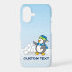 A little penguin cartoon waving in front of a snowball stack. Custom text.