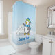 A little penguin cartoon waving in front of a snowball stack. Custom text.