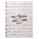 A forlorn-looking little pink piglet sits by a split rail fence in the digital watercolor in a pink-bordered oval at the center of this notebook. The background is filled with the word “oink” over and over in various fonts in pink. A great gift for anyone with a pig collection. From my original digitally-created image.