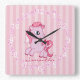 Personalize this wall clock printed with a cute pink pony on a striped background for a child with her name. Available in square or round style. Created with artwork by Angela Wenke at www.resaleclipart.com.