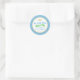 Little prince baby shower stickers in blue and green, with shimmery gold accents. "A Little Prince is on the way" followed by the mom-to-be's name - these custom stickers are great decorations for a prince themed baby shower.