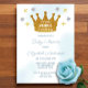 A little prince is on the way! Boy baby shower with gold crown and silver and gold stars with dreamy blue watercolor background