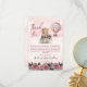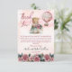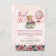 In the background, you'll see a pink hot air balloon floating in the clouds and sky to the right of the bear, adding a sense of adventure and wonder to the design. The entire invitation and accessories template is set on a spotted watercolor pink background that complements the design beautifully.