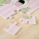 Sweet girl's puzzle, with graphics of a little girl wearing a crown, next to a pink flower and a pumpkin coach. Background is done in a pink stripe pattern, with graphic text, at the top, reading Little Princess. Pink shadow text is ready to personalize with your little princess's name.