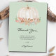 This stylish fall baby shower thank you postcard features a watercolor pumpkin and fall foliage on a soft green background. Perfect for an autumn boy, girl or gender-neutral baby shower. Easily customizable. Original Watercolor © Michele Davies.