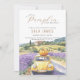 An elegant and pretty gender neutral invitation featuring "a Little Pumpkin is on the way" with a stunning country view - a classic car driving along the lavender fields with a cute pumpkin on top!