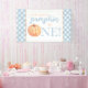 Our little pumpkin first birthday banner with watercolor pumpkin and pastel blue plaid.