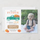 An autumn first birthday invitation with a vintage teal truck loaded with pumpkins in the back. Add your own photo to further customize.