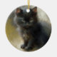 This painting features an adorable black kitten with soft, fluffy fur. She sits in a serene pose, as if calculating her next move. Her green eyes sparkle with curiosity as she studies her surroundings. The background of the painting is a soft, muted gray mixed with yellow/green, which helps to emphasize her dark coat. The overall effect is one of innocence, playfulness, and charm, making it a sweet addition to any room.