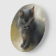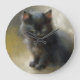 This painting features an adorable black kitten with soft, fluffy fur. She sits in a serene pose, as if calculating her next move. Her green eyes sparkle with curiosity as she studies her surroundings. The background of the painting is a soft, muted gray mixed with yellow/green, which helps to emphasize her dark coat. The overall effect is one of innocence, playfulness, and charm, making it a sweet addition to any room.