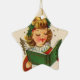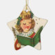 Little blond angel dressed in red with green holly leaves in her hair. She has an open green songbook in her hands and is singing
