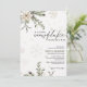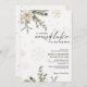This beautifully illustrated baby shower invite features a peaceful winter scene with delicate white and silver snowflakes, evergreen foliage, and soft florals in muted taupe, sage, beige, and ivory. The soft color palette and natural elements give this design a warm, rustic winter vibe, ideal for celebrating a baby on the way during the holiday or snowy season.