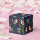 The pattern on this little Favor Box is an original illustration of little song birds. The birds are facing each other, as if they are singing, against a deep marine blue background dotted with tiny yellow stars. There are vertical rows of twirled red ribbons, with groups of green leaves between the little brown birds.