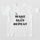 This children’s T-shirt features a dynamic graphic design of a person wake surfing, with a stylized wave below and a bird flying overhead. The words “WAKE SURF REPEAT” are prominently displayed above and below the surfer in bold, capital letters. This design captures the thrill and excitement of wake surfing, making it a perfect choice for young water sports enthusiasts.