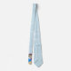 This neck tie has a little swimmer girl with big eyes wearing a pink bathing suit with polka dots about to dive into a blue lake under a blue sky with clouds.