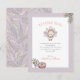 This Girl Fall & Thanksgiving Baby Shower Thank You card features a cute hand-drawn baby girl turkey, a pie and fall leaves on the front with customizable thank you message and family name. The back features a gingham feather pattern on a lilac background.