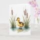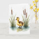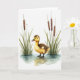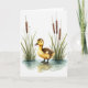 This design shows a small young waterbird centered in shallow, lightly rippled water, its dark webbed feet making soft rings and reflections. The fluffy body is painted in golden-yellow down that shifts into speckled brown along the head and back, giving it a gentle, cuddly look 🐇. Slender green reeds rise on both sides like quiet companions, leaning in as if keeping the little bird company. A soft white background and even light keep the scene airy, with no harsh shadows, so the bird’s curious dark eye feels like it’s meeting yours in a tender, friendly way. The greeting sits near the top in a simple, medium-size font, colored in muted green to match the reeds, with a smaller line of text placed near the bottom in warm brown. The water is washed in pale grays and light blue tones, and the plants include segmented brown stems that add texture without crowding the scene 🌷. One thin stalk near the edge carries a tiny dash of deep red, standing out against the gentle greens and browns.