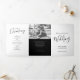 Simple script text and little white heart wedding program with your own two photos, love story, the order of ceremony, wedding party and thank you sections. Personalize this black and white mono wedding trifold program with your own wedding ceremony names and details. Other colors and matching wedding items available. © Design by Sarah Trett for www.mylittleedenweddings.com on Zazzle.