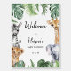 Welcome guests to your "Little Wild One" safari baby shower with a beautifully designed welcome sign featuring adorable safari animals like lions, giraffes, elephants, and zebras. The sign is adorned with lush greenery, jungle leaves, and earthy tones, creating a warm and inviting atmosphere that perfectly complements your safari theme. The playful animals add a touch of whimsy, setting the tone for a fun-filled celebration. This charming sign is the perfect way to greet your guests and introduce them to the adventure of celebrating the soon-to-arrive little wild one!