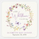 Elegant light cream baby girl shower sticker for your invitations, party favors and thank you cards featuring "a little wildflower is on her way" in modern grey typography and a stylish lavender script, a boho-inspired watercolor wreath of purple, pink, peach and yellow wildflowers, and a purple butterfly. Personalize the mother's name and shower date in simple lavender and grey typography.