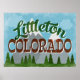 Littleton Colorado neo vintage travel poster wall art in cartoon retro style. It features snowy mountains and forest below with fun and happy retro text.