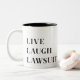 Funny mug for your favorite Lawyer. Text reads "Live Laugh Lawsuit". Justice scales illustration on opposite side.