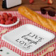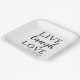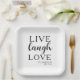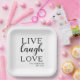 Modern style 'live, laugh, love' custom name and year established tableware is perfect for anniversaries. Simple black and white typography design.