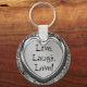 Those famous three words: "Live, Laugh, Love," in bold black text on a smooth silver 3d metal heart which is on a shimmering, glittering sequins background. An inspirational, great saying to live by. Nice for weddings, silver 25th anniversaries, valentine's day, new year's and birthday parties,etc. A lovely, fun keychain and a unique keychain for yourself or as a gift for that someone special.