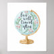 Cute art print design for world travelers features a watercolor globe illustration with "live well, travel often" inscribed in hand lettered calligraphy and surrounded by tiny pink blossoms and green leaves.