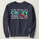Live your life crazy and love every second of it. Funny saying design with a face and a heart.