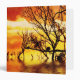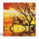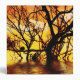 silhouette of tree branches submerged in water and a lone bird sittin on the branches against an orange sunset sky..