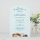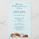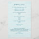 Living seas wedding program printed on affordable paper. Customize text on both sides over a light blue wood image. On the front, the bottom has realistic seashells and a sand dollar. Text is deep sea blue color and alternates between script and printed fonts. Space is given on the back for a short message from the couple. The paper is 5.5 x 8.5 in size.