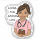 Funny pun with Hispanic nurse, doctor, medical assistant, caregiver, CNA cartoon ethnic female in pink scrubs. Living the scrub life.